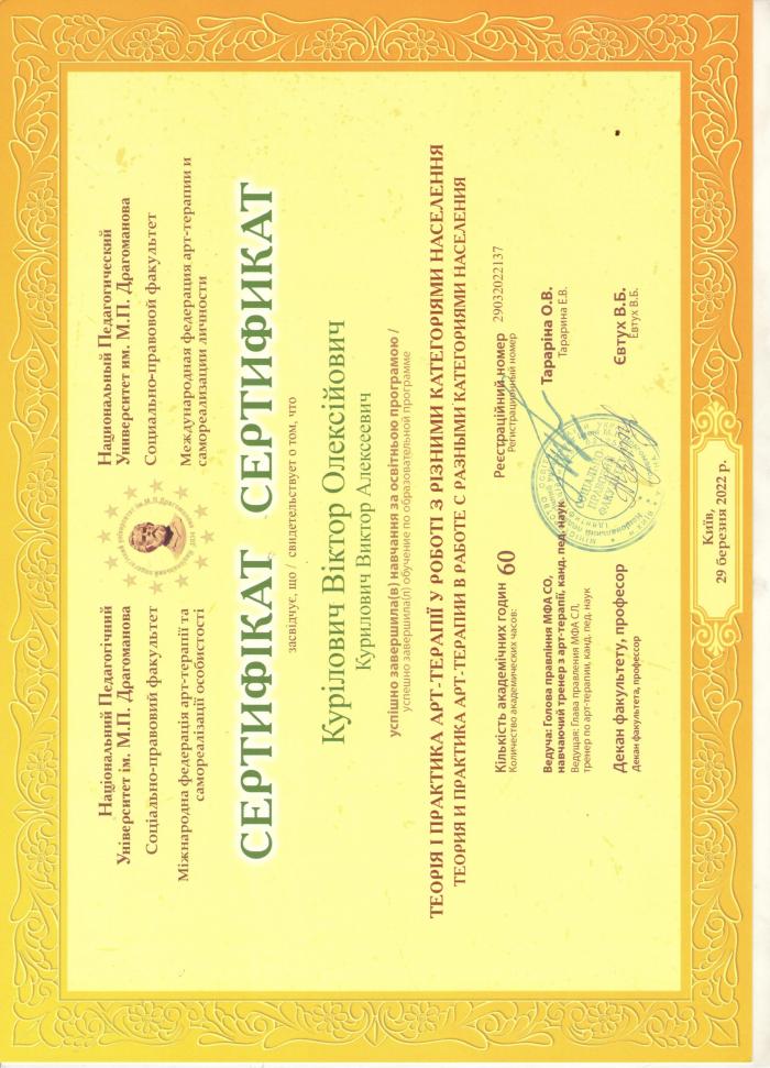 Далее институт. После окончания Херсонского государственного университета устроился в ХГЦССДСДМ, если коротко то Социальная служба. Тут уже начинаеться психологическая практика. Но все же основная часть практики протекала в частном консульировании. И вот ужее более 10 лет я помогаю людям справляться с их запросами. Выбрав для себя и изучив наиболее интересные подходы (Арт-терапия, ЭОТ и клиент-центрированная психотерапия). Не были мной упущенны и другие направления, но сосредоточился на том что наиболее цепляет.